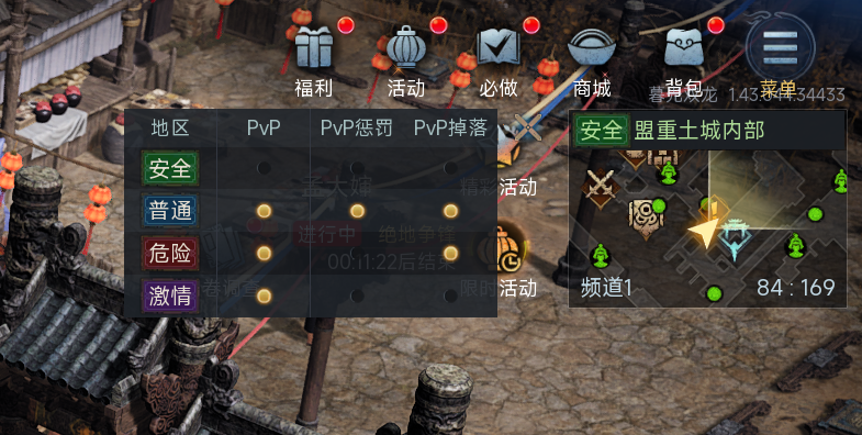 危险:可自由选择模式,如果PK,不会受到红名惩罚,死亡可掉落